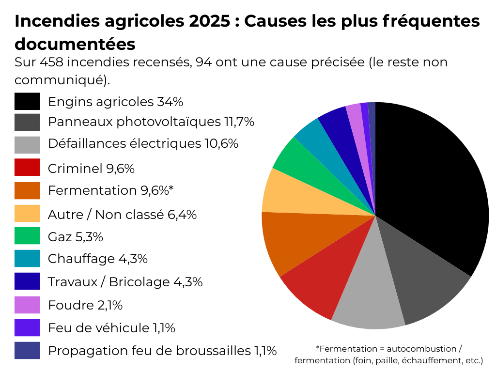 installations électriques défaillantes, co-stockage de matériaux inflammables avec des animaux, engins agricoles en surchauffe, défauts de maintenance ou de prévention.