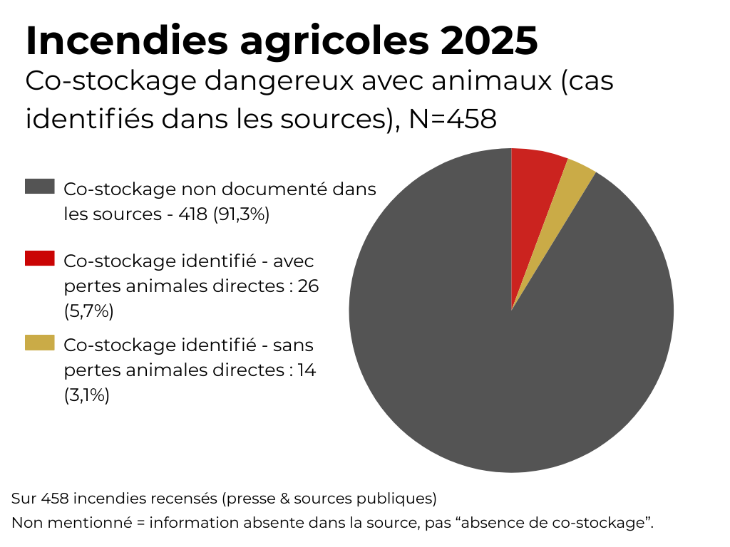 Dans une part significative des incendies recensés, des matériaux ou équipements à risque étaient stockés dans le même bâtiment que les animaux.