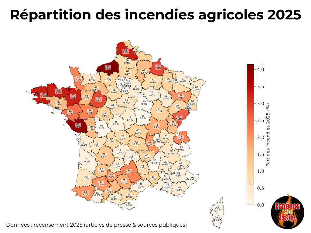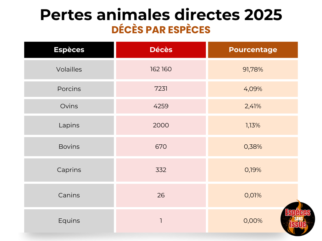 Dans ce tableau, les volailles (poules, poulets, poussins, cannetons, canards, dindes) apparaissent comme l’espèce la plus touchée par les incendies agricoles en 2025, avec, au minimum 162 160 décès, soit 91,78 % des pertes animales directes recensées.