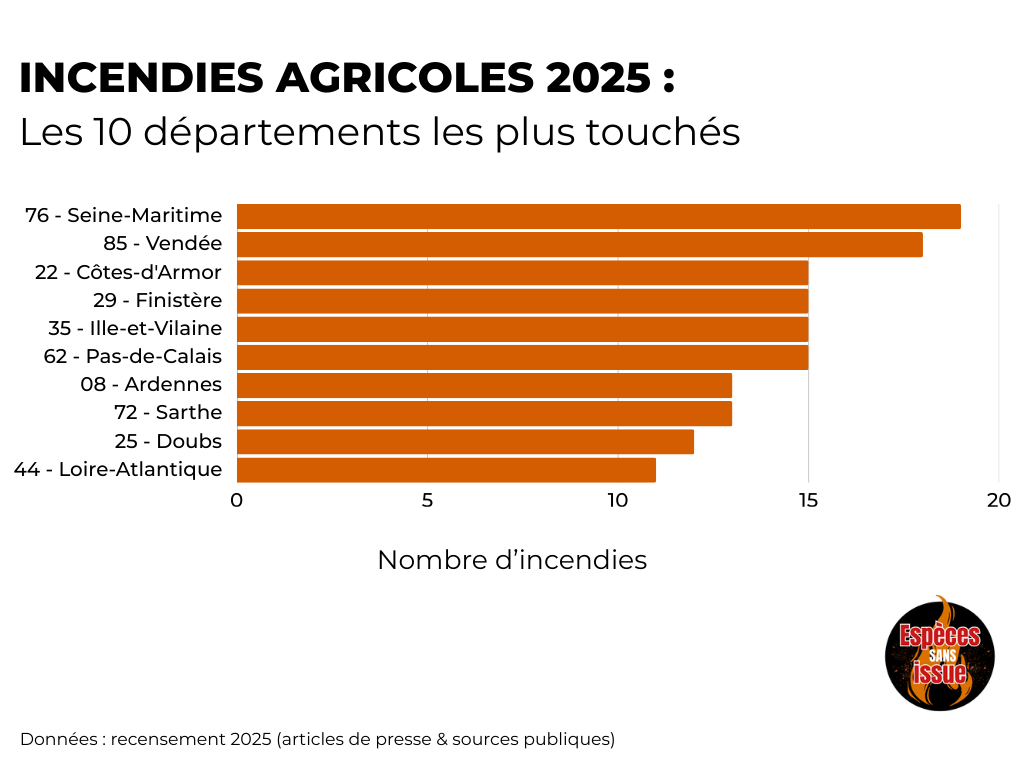 Il rassemble les incendies d’exploitations agricoles parmi lesquels certains ont entrainé la mort d’animaux d’élevage, brûlés vifs ou asphyxiés.